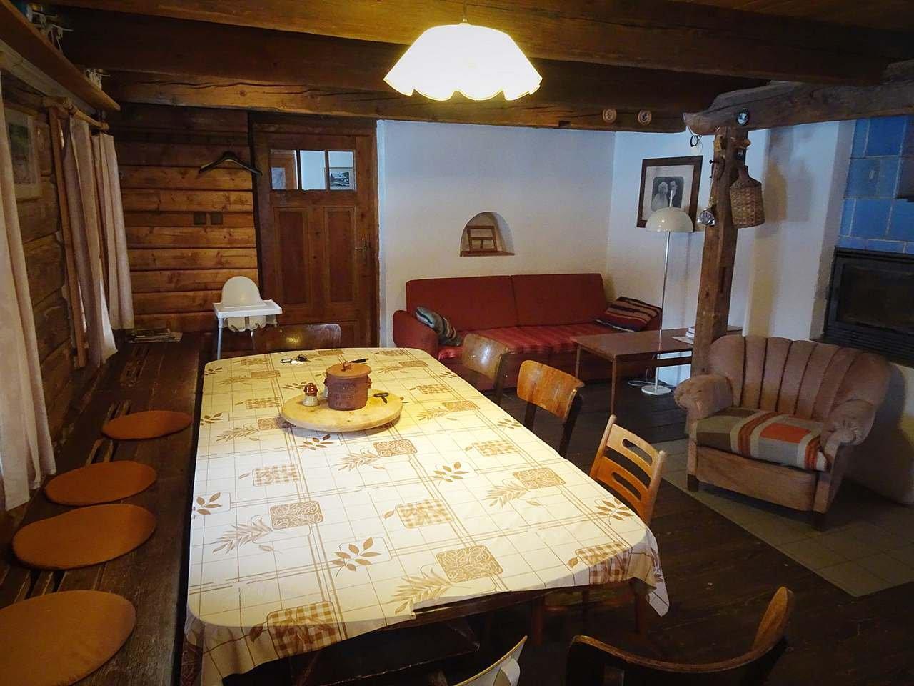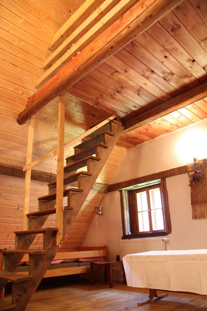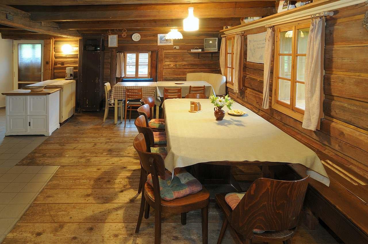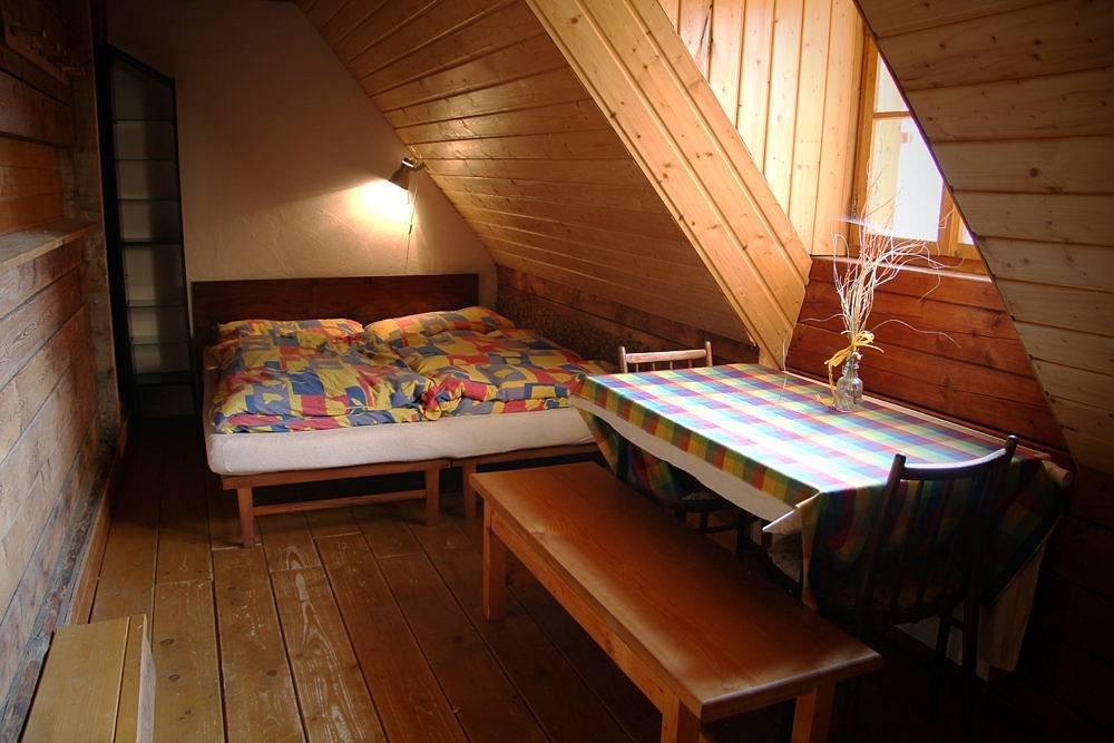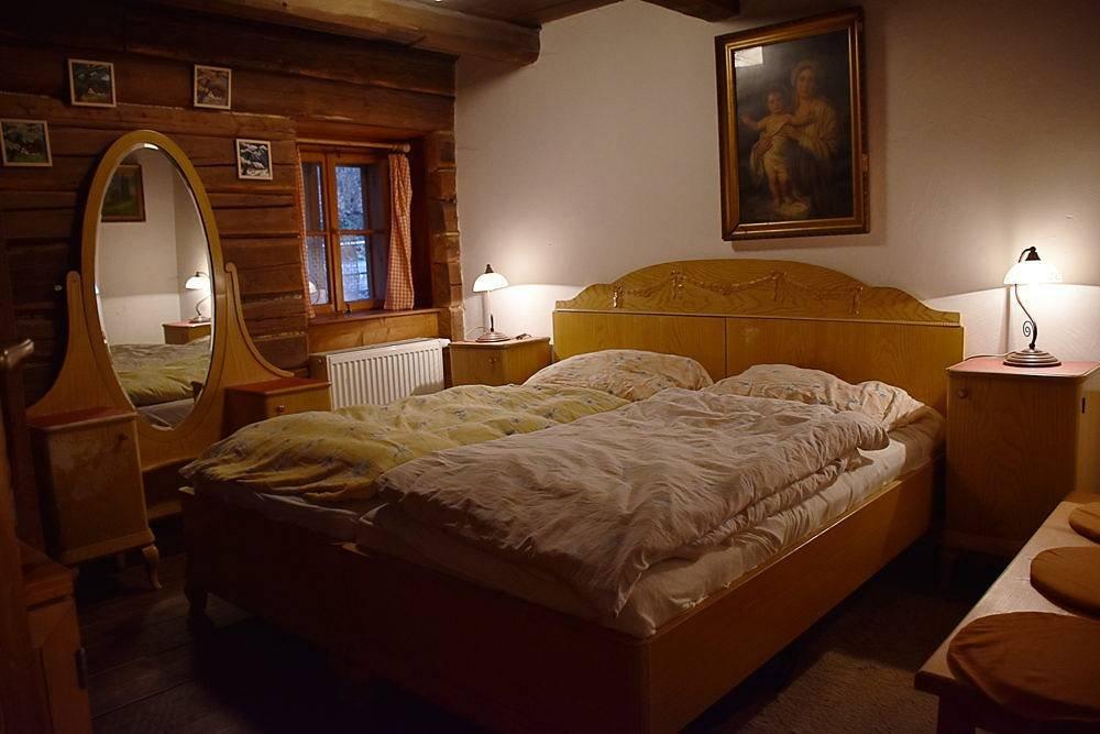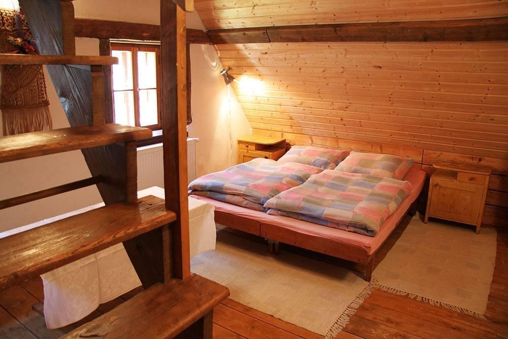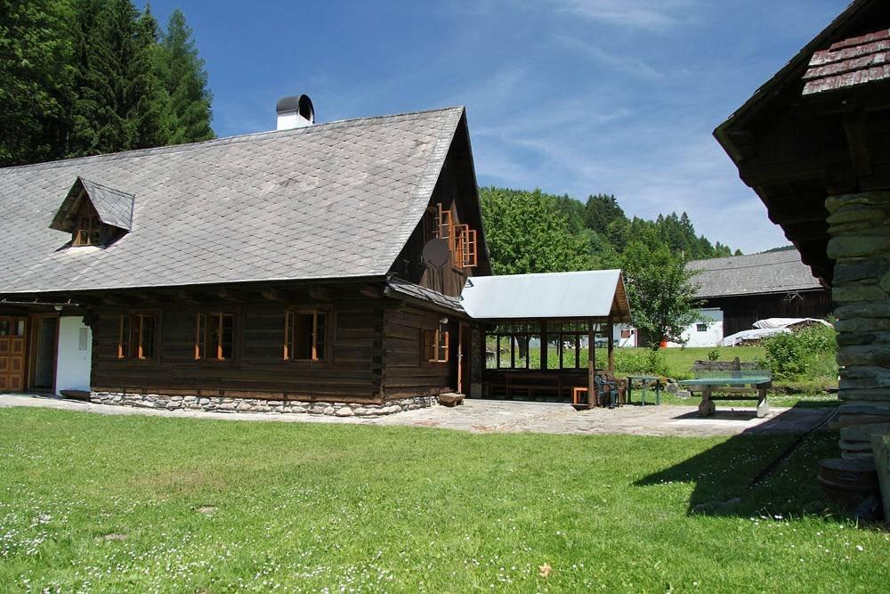 Velká rekreační stylová chalupa s bezbariérovým vstupem poskytuje prostornou kuchyň s kachlovými kamny a posezením u krbu, elektrický sporák s troubou, odsavač par, myčku, lednici, mikrovlnnou troubu, kávovar, varnou konvici, BVT, satelit, rádio, společenské hry. K dispozici koupelna s vanou, sprchou, 2x WC, automatická pračka, 5 ložnice (v přízemí 1x dvojlůžko, 1x4 lůžka, v podkroví 2x5 lůžek a 1x6 lůžek), sauna, lyžárna, úschovna kol ve stodole, malá vodní nádrž, dětské pískoviště, houpačka. Vytápění je centrální plynové a kachlovým sporákem. V letním období zahradní nábytek, stolní tenis, přenosný gril. Součástí objektu je zahrada s loukou 3000 m2, ohniště. Majitel neposkytuje ložní prádlo, pouze za poplatek 80 Kč/ks. Žádá vratnou kauci ve výši 2.000,- Kč, úhradu el. energie, plynu, dřeva a rekreačního poplatku (29,- Kč/os./noc osoby 18-70 let). Pes povolen 150,- Kč/noc. Parkování u objektu. Zastávka ČSAD 2 km, ČD 2 km. Restaurace 2 km.